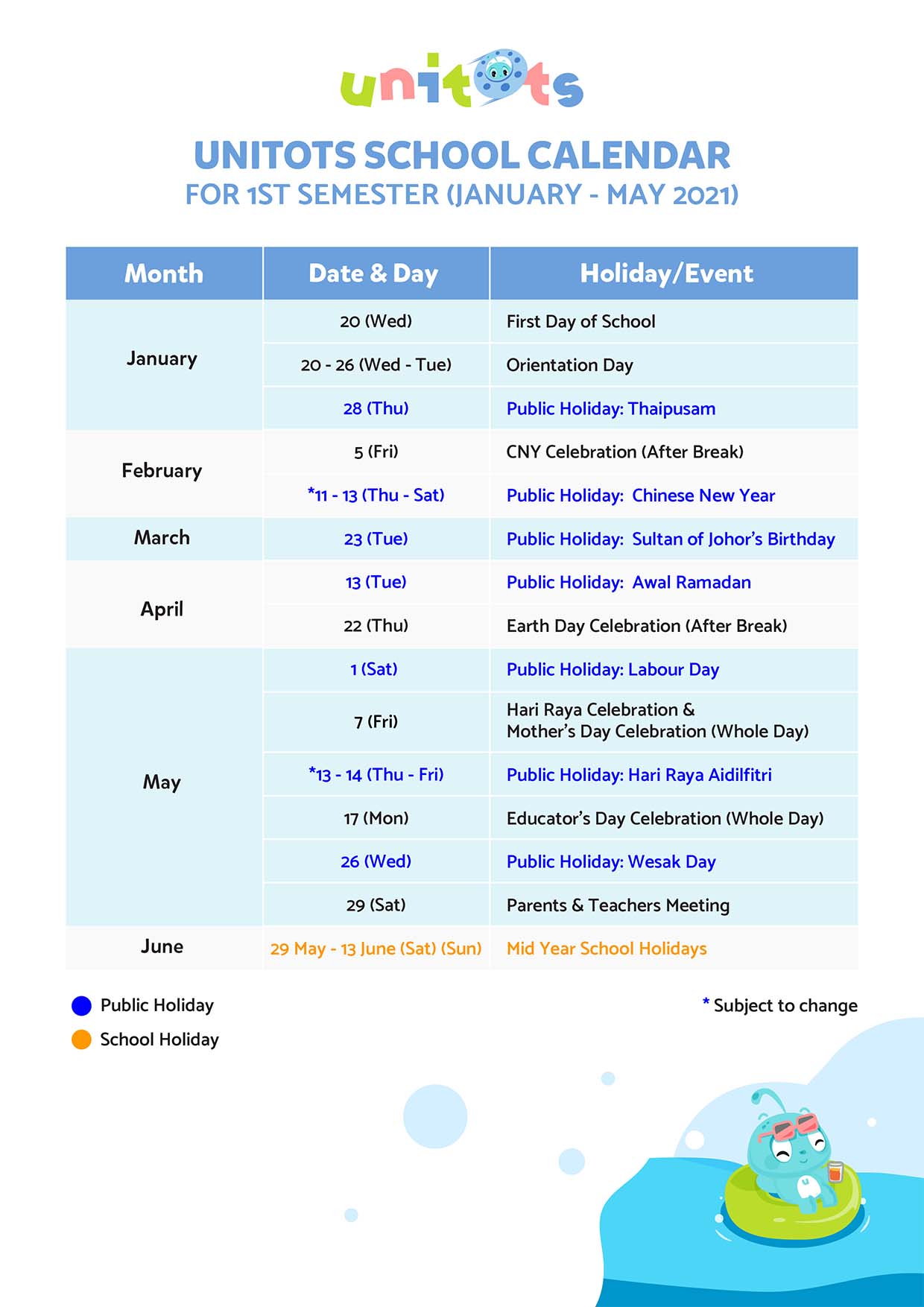 The school calendar tells you when terms start and finish during the school year including half terms and bank holidays.